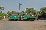Lok 7 med fyldte vogne krydser pladsen ved indgangen til møllen