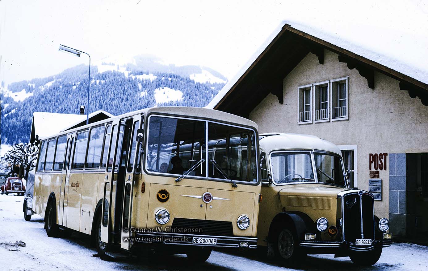 Postbusser ved postkontoret i Gstaad i februar 1970