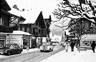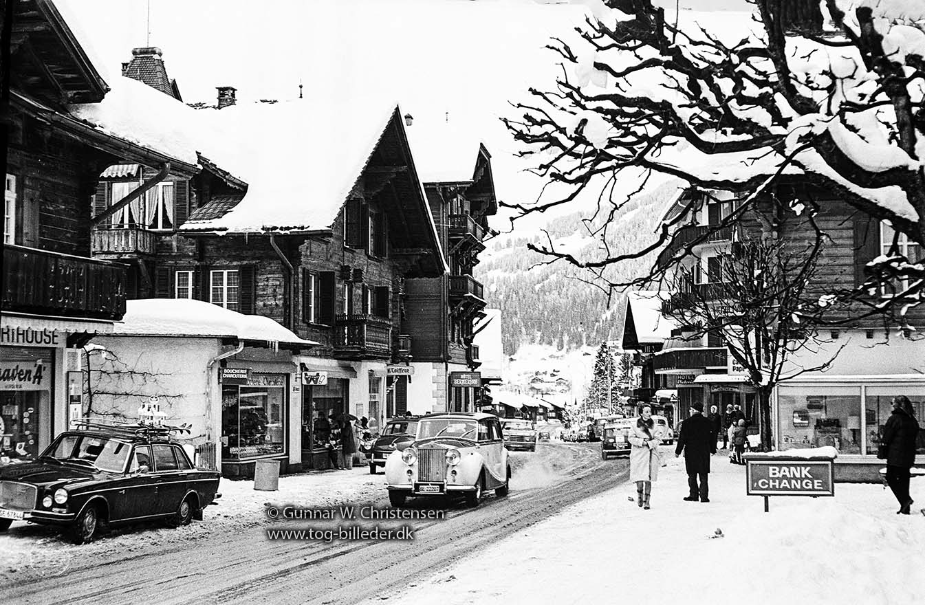 Hovedgaden med en Rols Royce i Gstaad i februar 1970