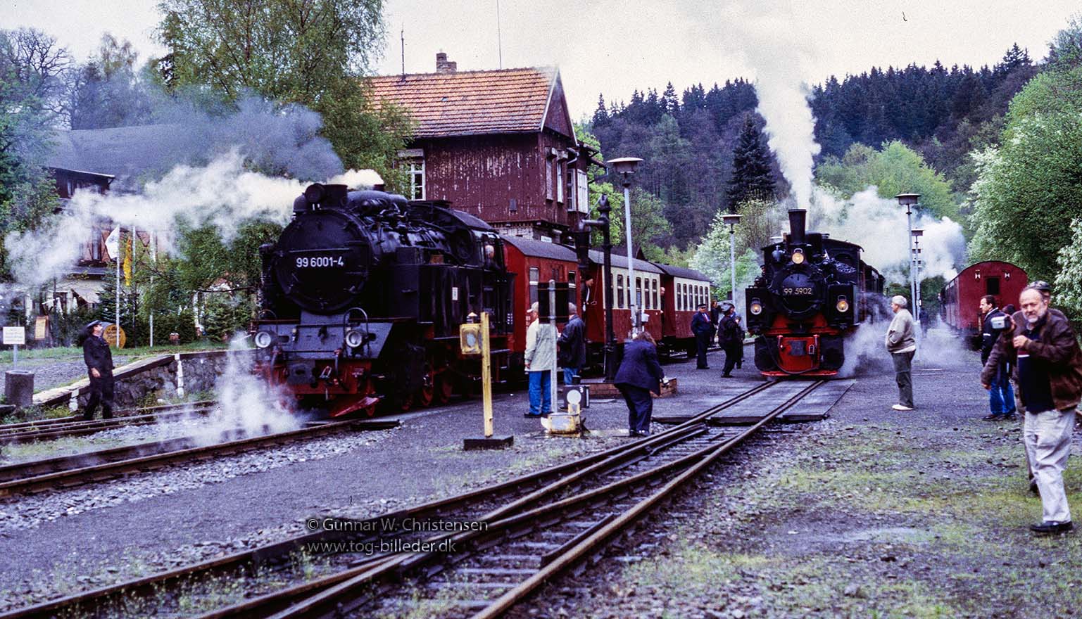 99 6102-0 med tog til Stiege og 99 5902 med tog til Harzgerode afgår