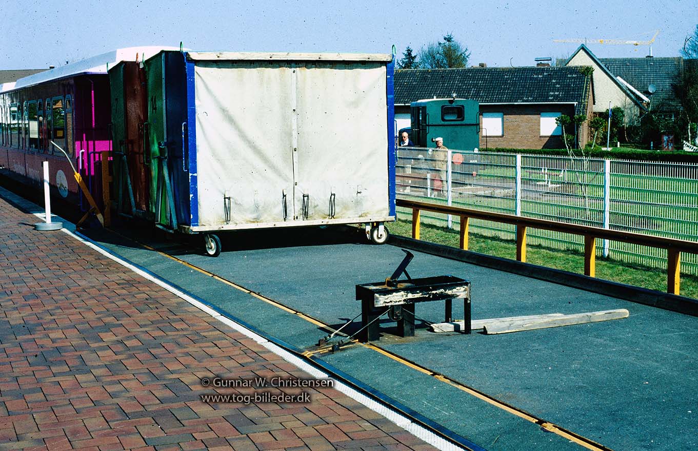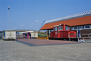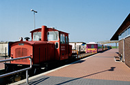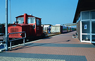 Lok med transportvogne i stationebygningen i Langeoog by 24.04.2005