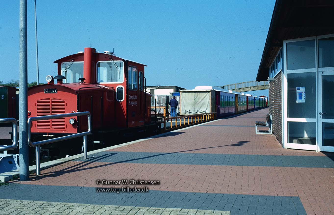 Inselbahn Lageoog Schöma diesel Lok 4 med stamme ankommet til Langeoog