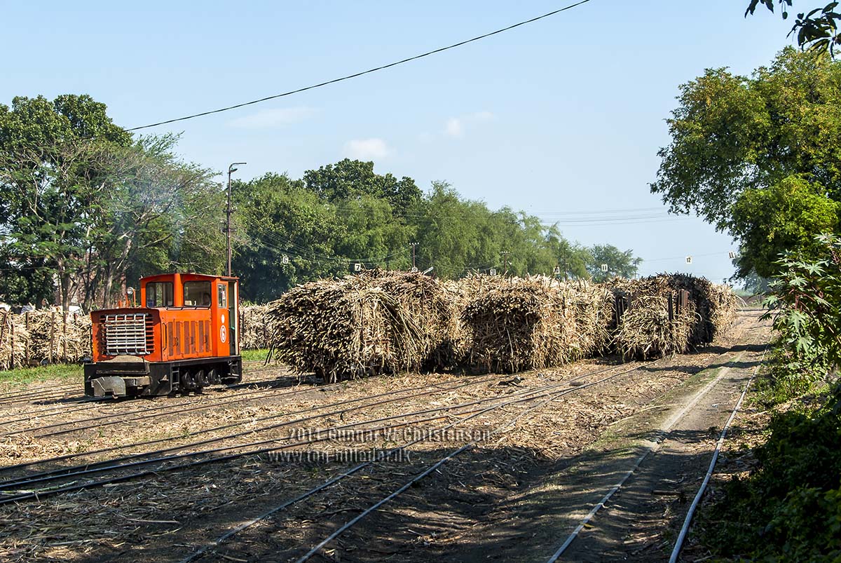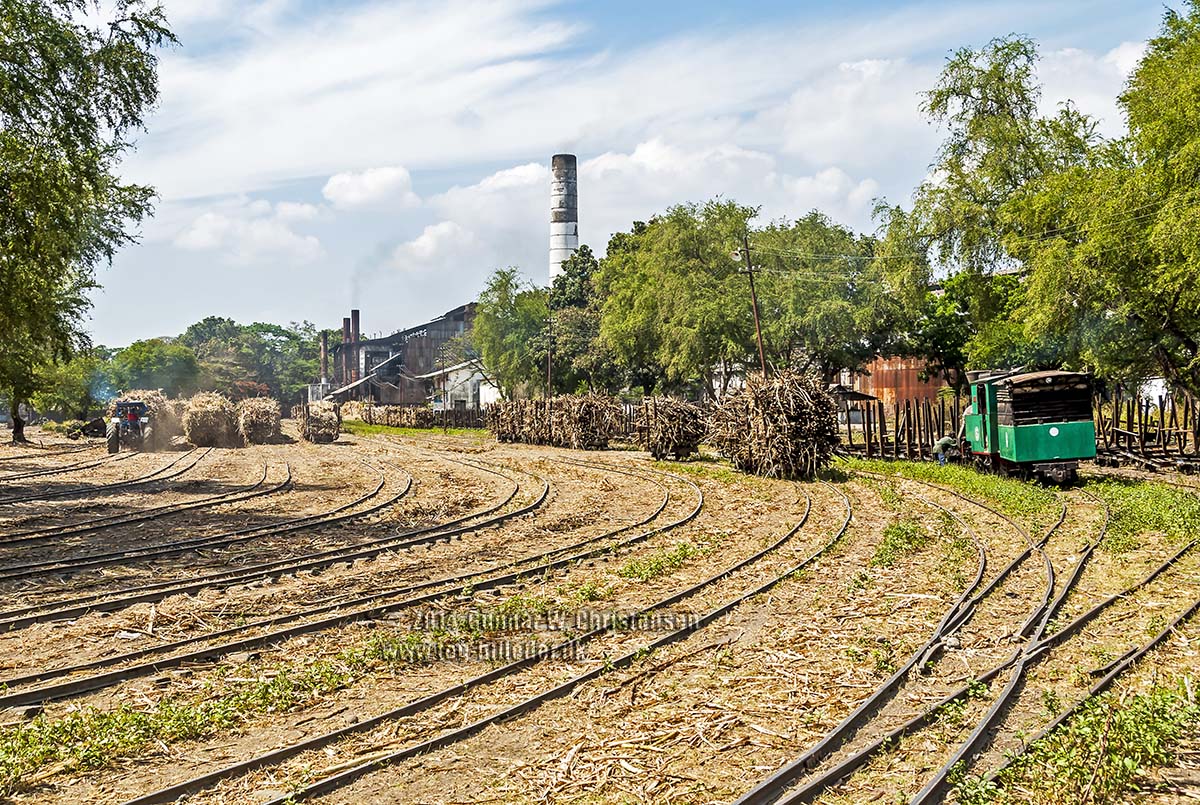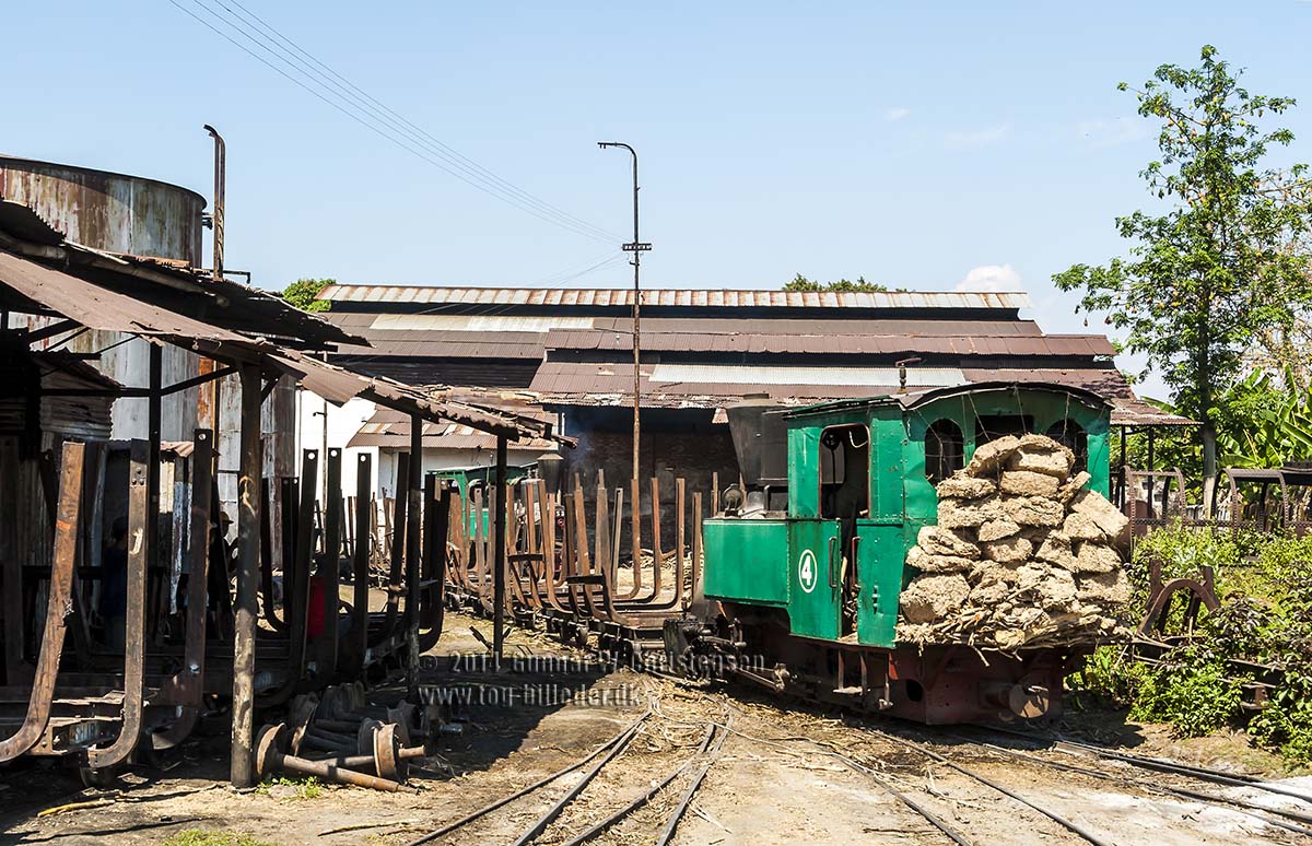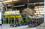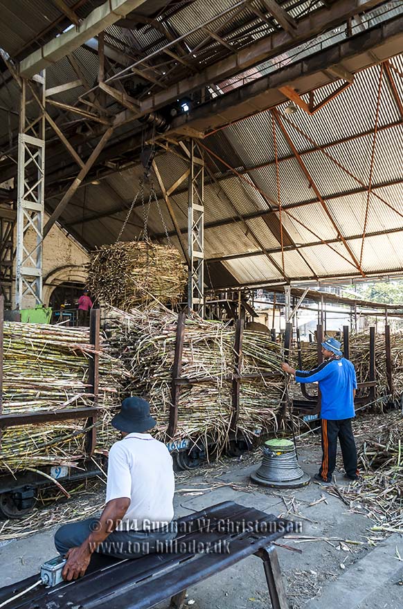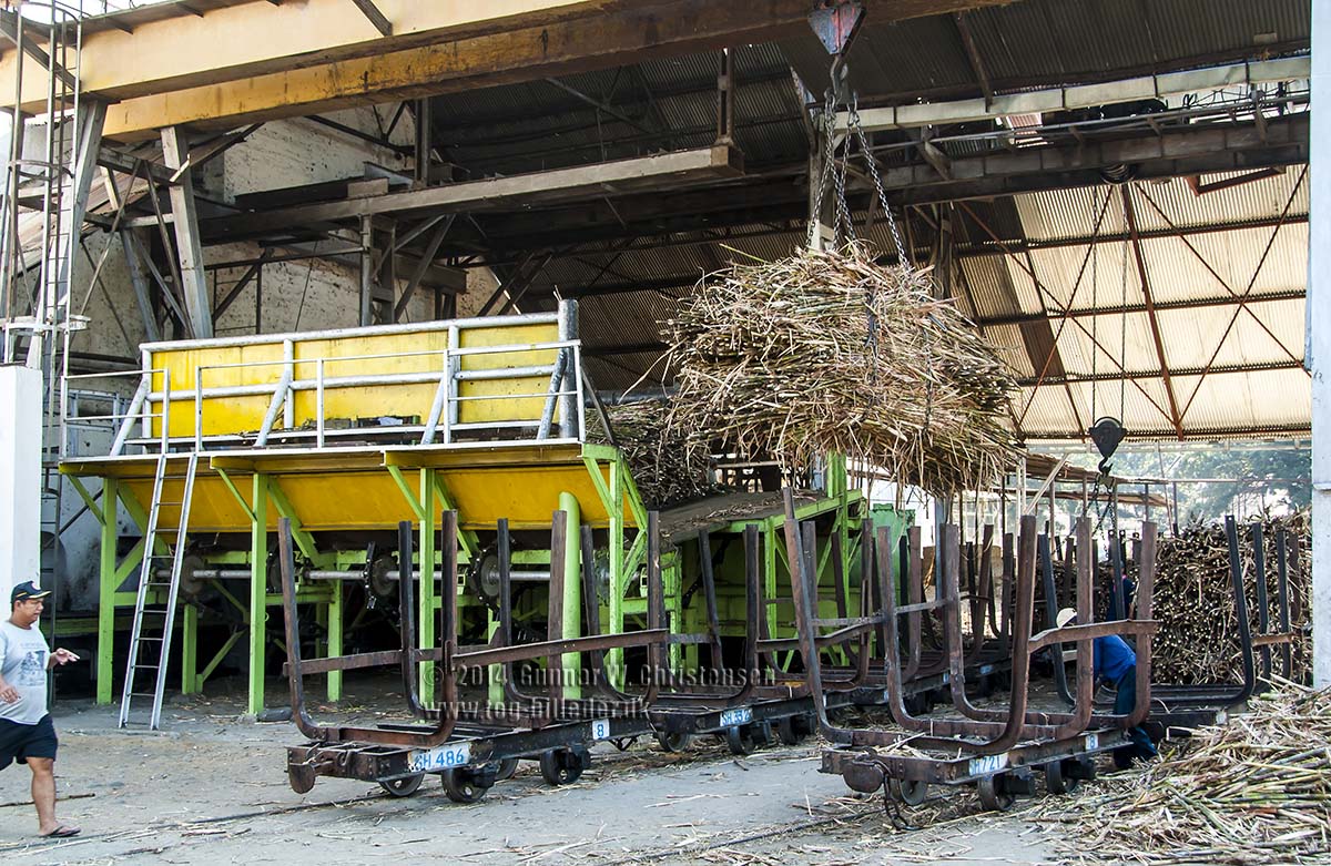 Fyldte vogne tømmes for sukkerrør som løftes hen til transportbåndet på